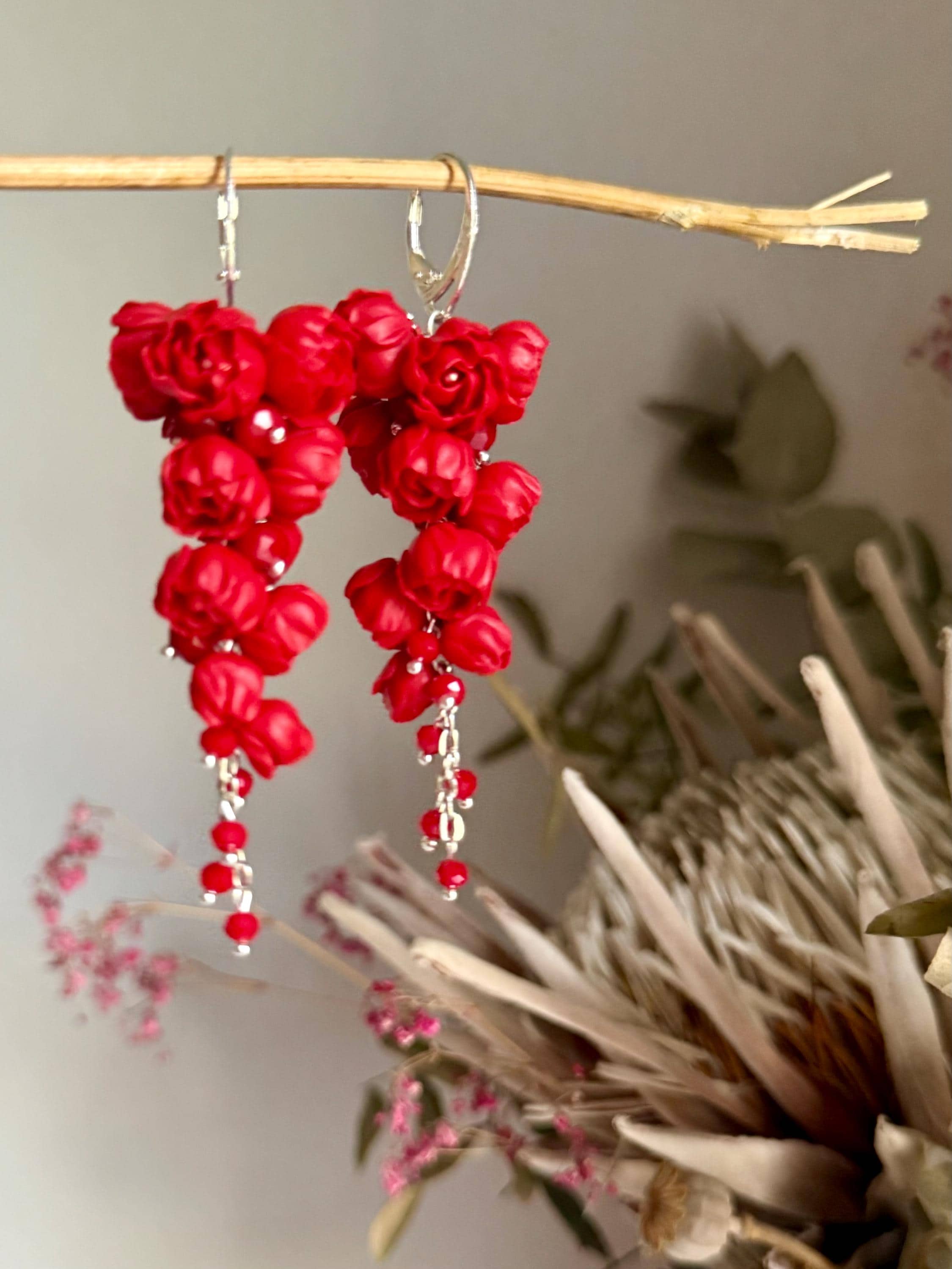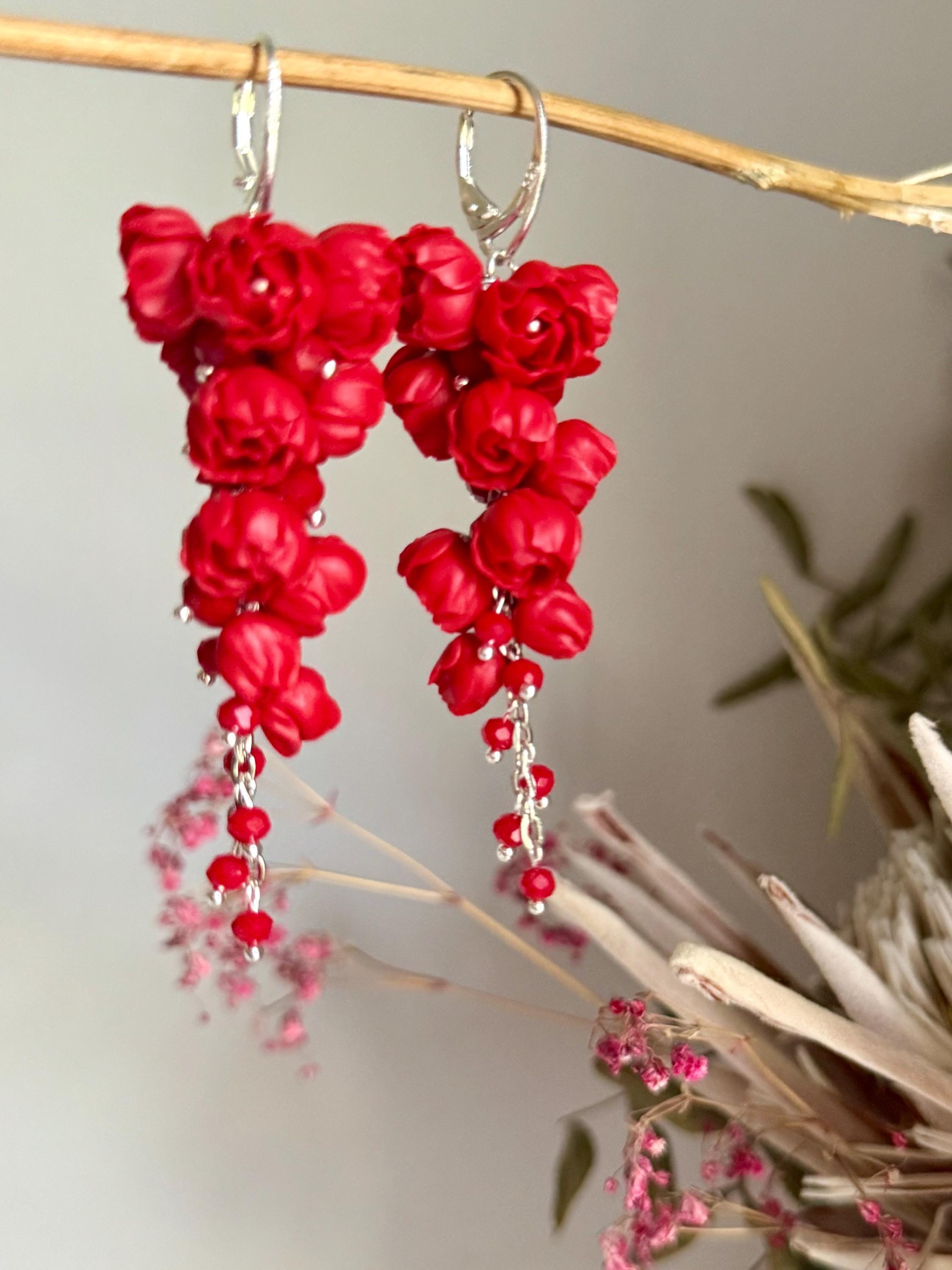 Peon red statement earrings Chandelier long clay mini Peony earrings Botanical flower jewelry Peony floral design Realistic floral earrings
